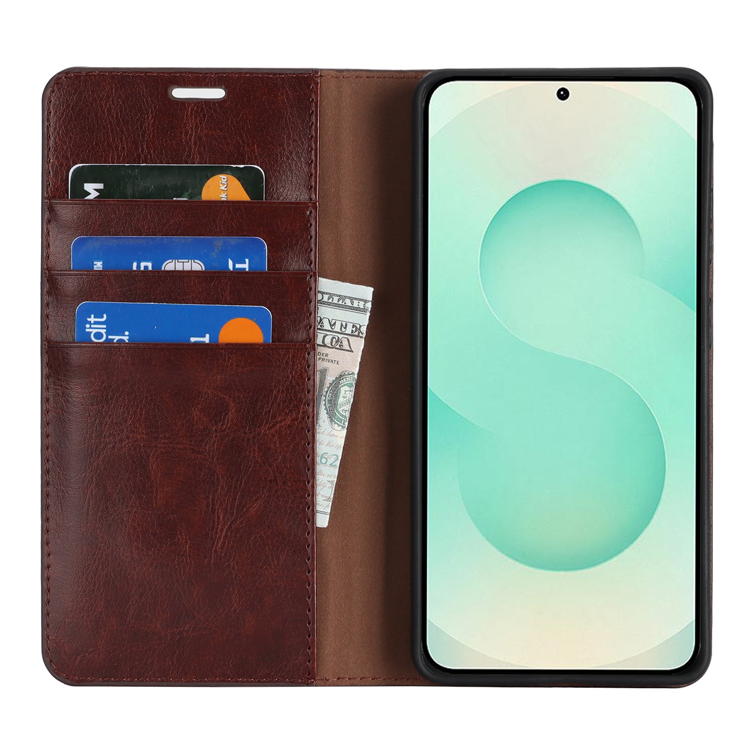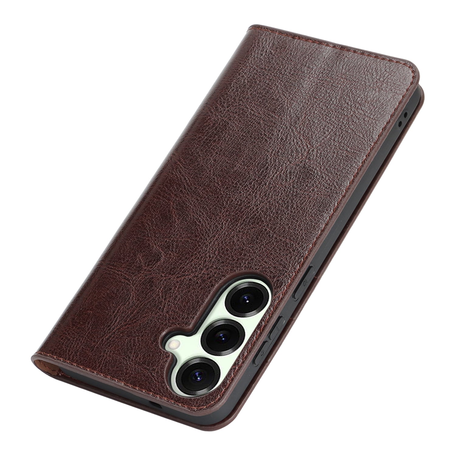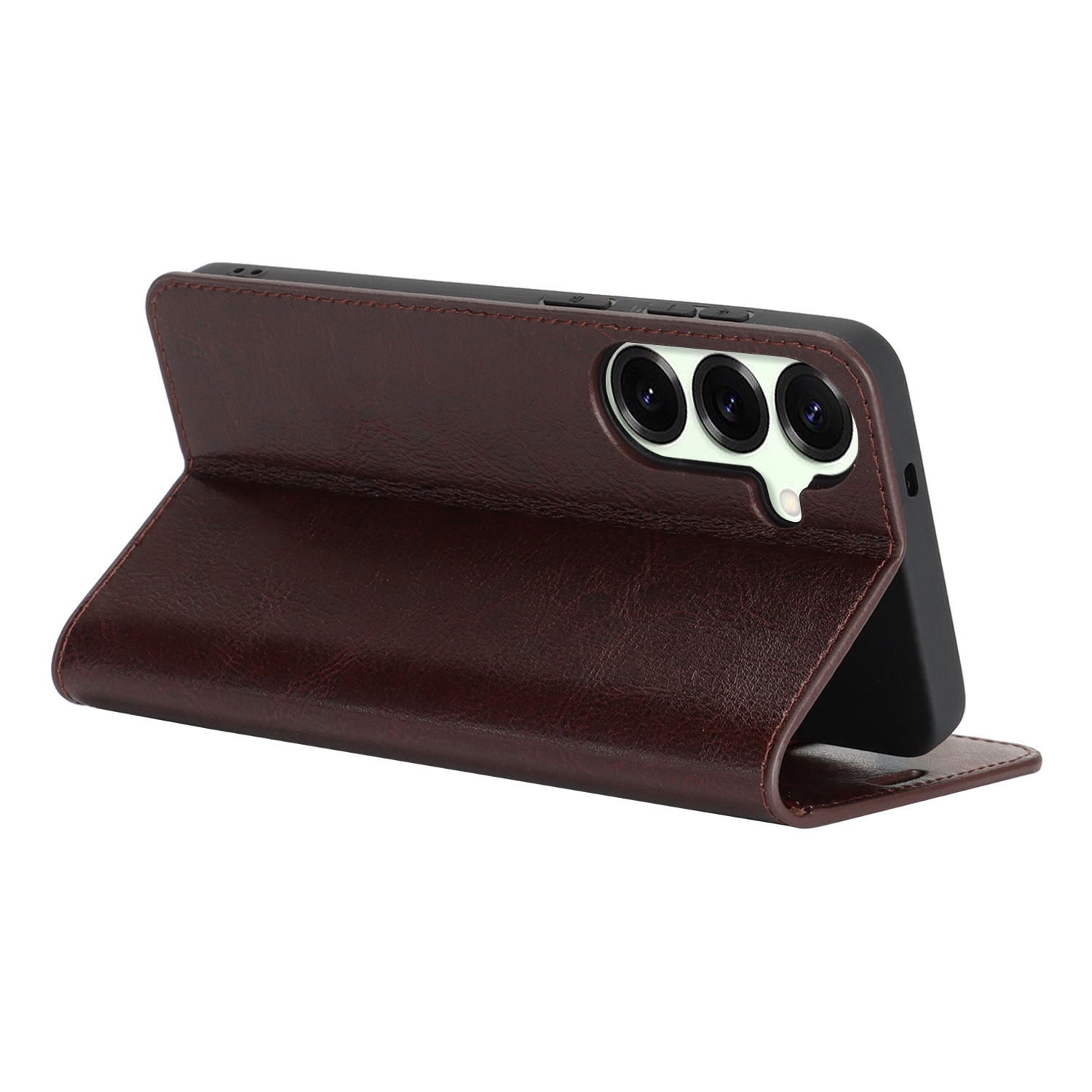 Beskytt din Samsung Galaxy S26 med et etui i ekte skinn. Til tross for den slanke og smarte designen, har etuiet 3 kortlommer og 1 seddellomme på innsiden av lokket. Telefonen festes trygt i et fleksibelt deksel som holder den sikkert på plass.