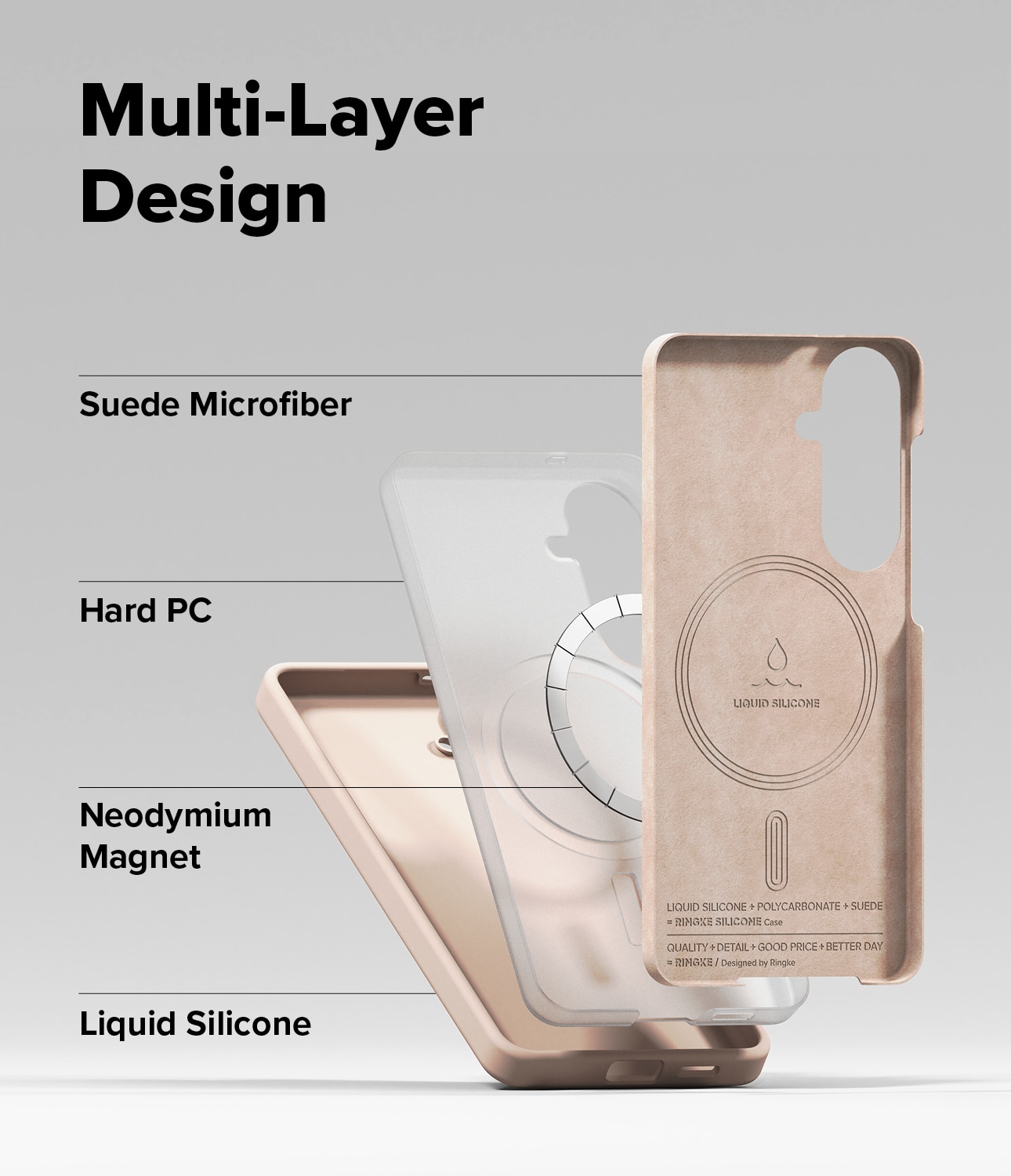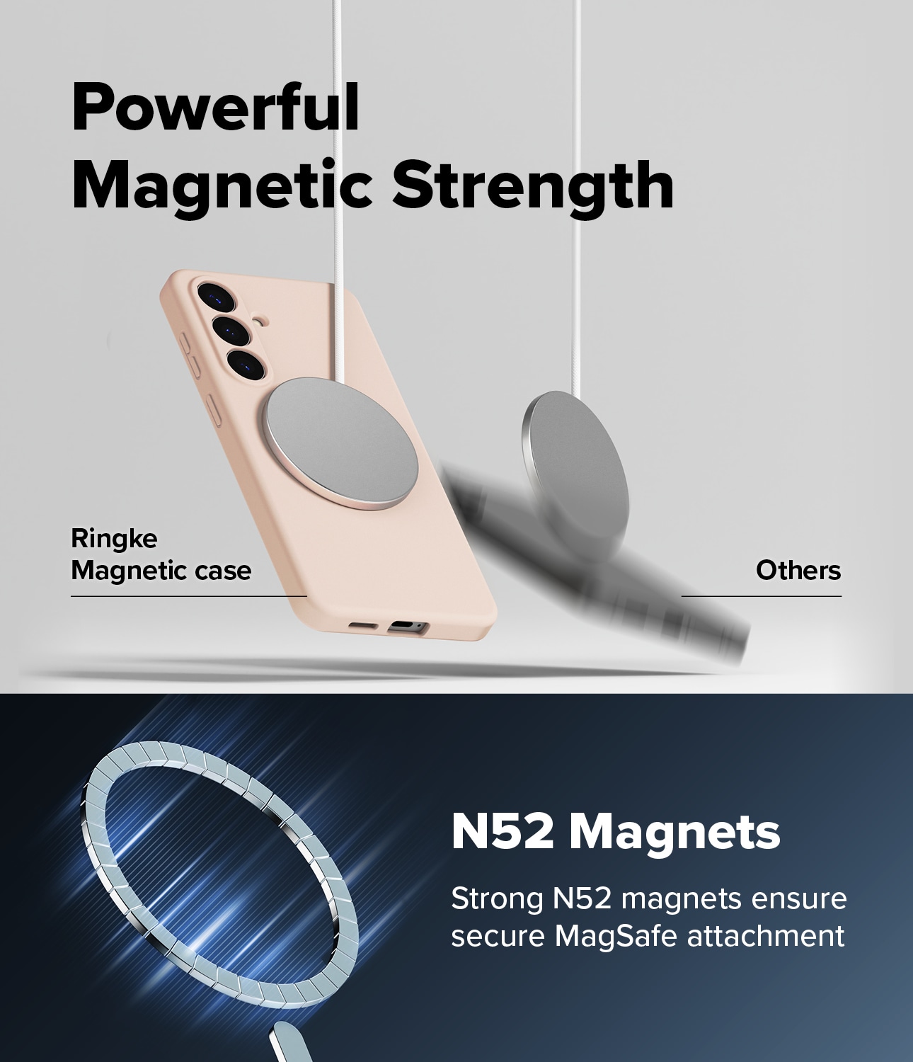 Stilrent silikondeksel med MagSafe fra Ringke til Samsung Galaxy S26. Dekselet er støtdempende for å beskytte mot skader, og MagSafe-støtten gjør at du kan bruke MagSafe-tilbehør og lade med MagSafe - uten å ta av dekselet.