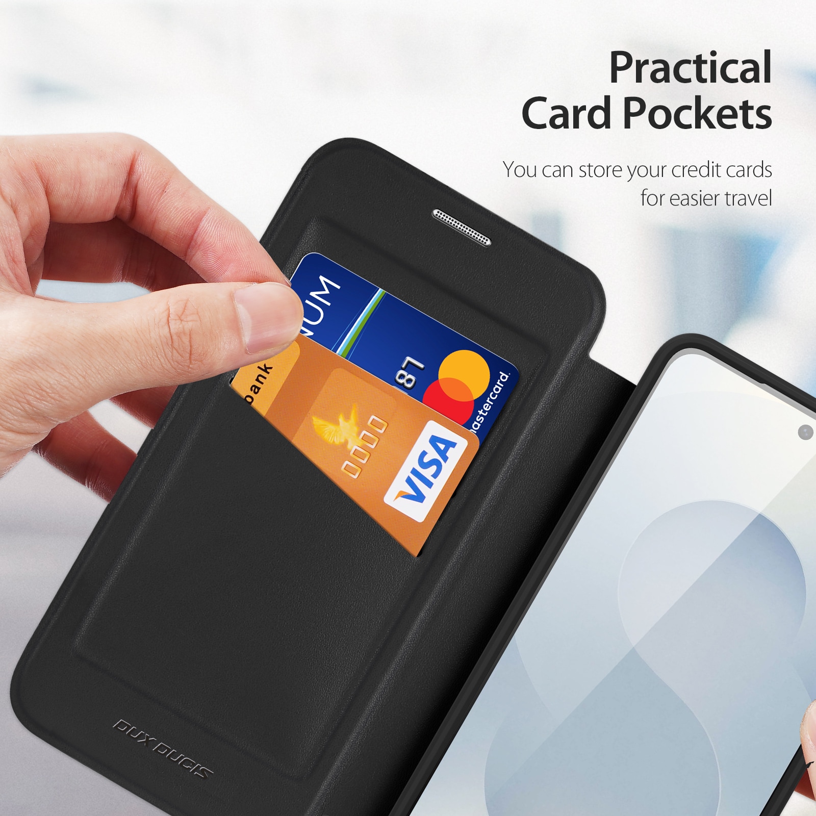 Tynt omslag med kortspor og MagSafe fra Dux Ducis til Samsung Galaxy S26. Til tross for sin slanke og lette design, beskytter denne vesken hele telefonen. Telefonen sitter trygt fast i det støtabsorberende indre dekselet, laget av hardplast med en ram av TPU.
