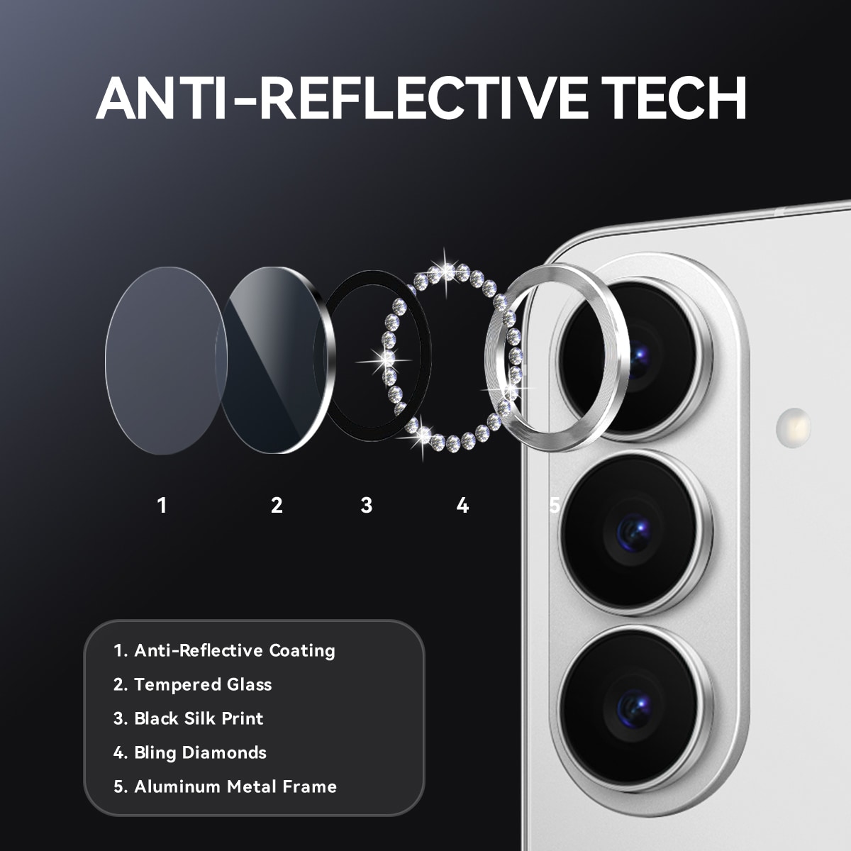 Beskytt kameralinsene på din Samsung Galaxy S26 med en linsebeskytter i herdet glass med glitrende rhinestones fra Northjo. Den gir pålitelig beskyttelse mot riper og støt, samtidig som kameraet får et elegant og eksklusivt utseende. Den heldekkende designen beskytter hele linsen uten å påvirke bildekvaliteten.