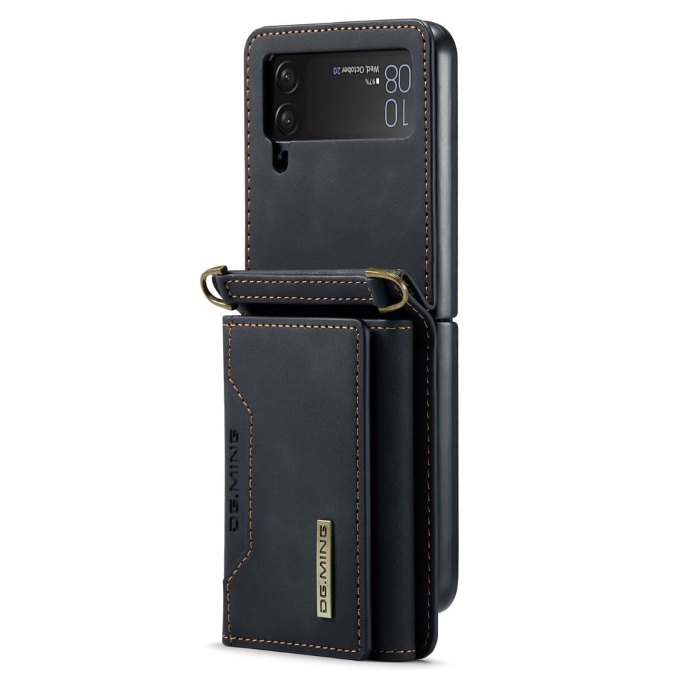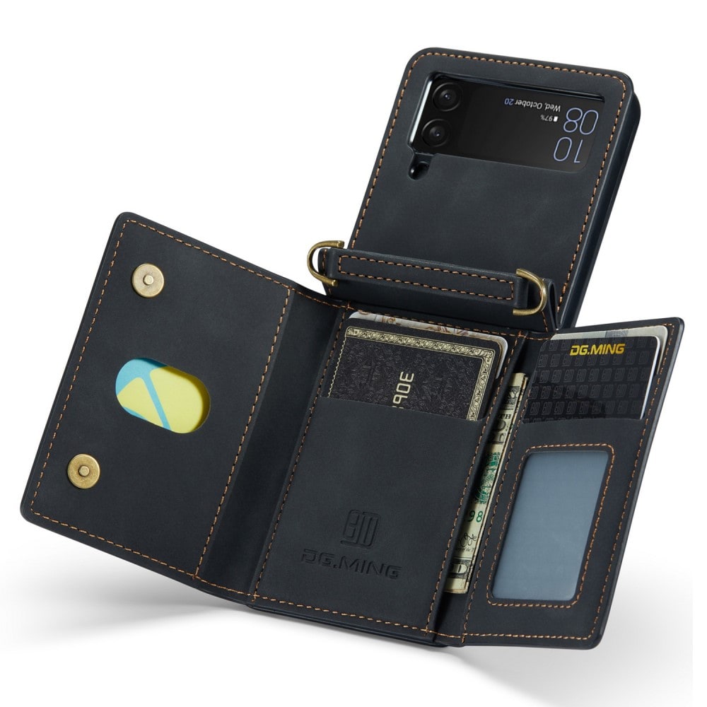 Deksel til Samsung Galaxy Z Flip 3 med integrert lommebok. Lommeboken sitter fast på baksiden av dekselet og følger enkelt med deg uansett hvor du går! Når du bretter ut lommeboken, fungerer den også som et stativ - perfekt for å se film eller videoklipp.