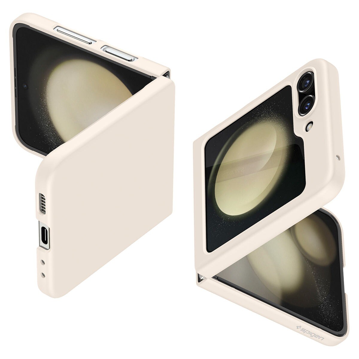 Ordentlig smalt og lett Spigen Air Skin-deksel til Samsung Galaxy Z Flip 5. Dekselets tynne design gjør det knapt merkbart når det beskytter rundt telefonen. Den robuste overflaten gjør at telefonen ligger perfekt i hånden uten å skli ut. Det holder også fingeravtrykk og annet smuss vekk fra dekselet.