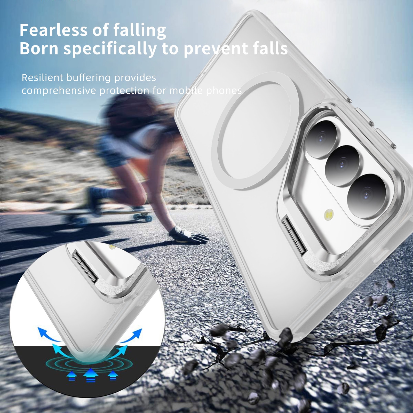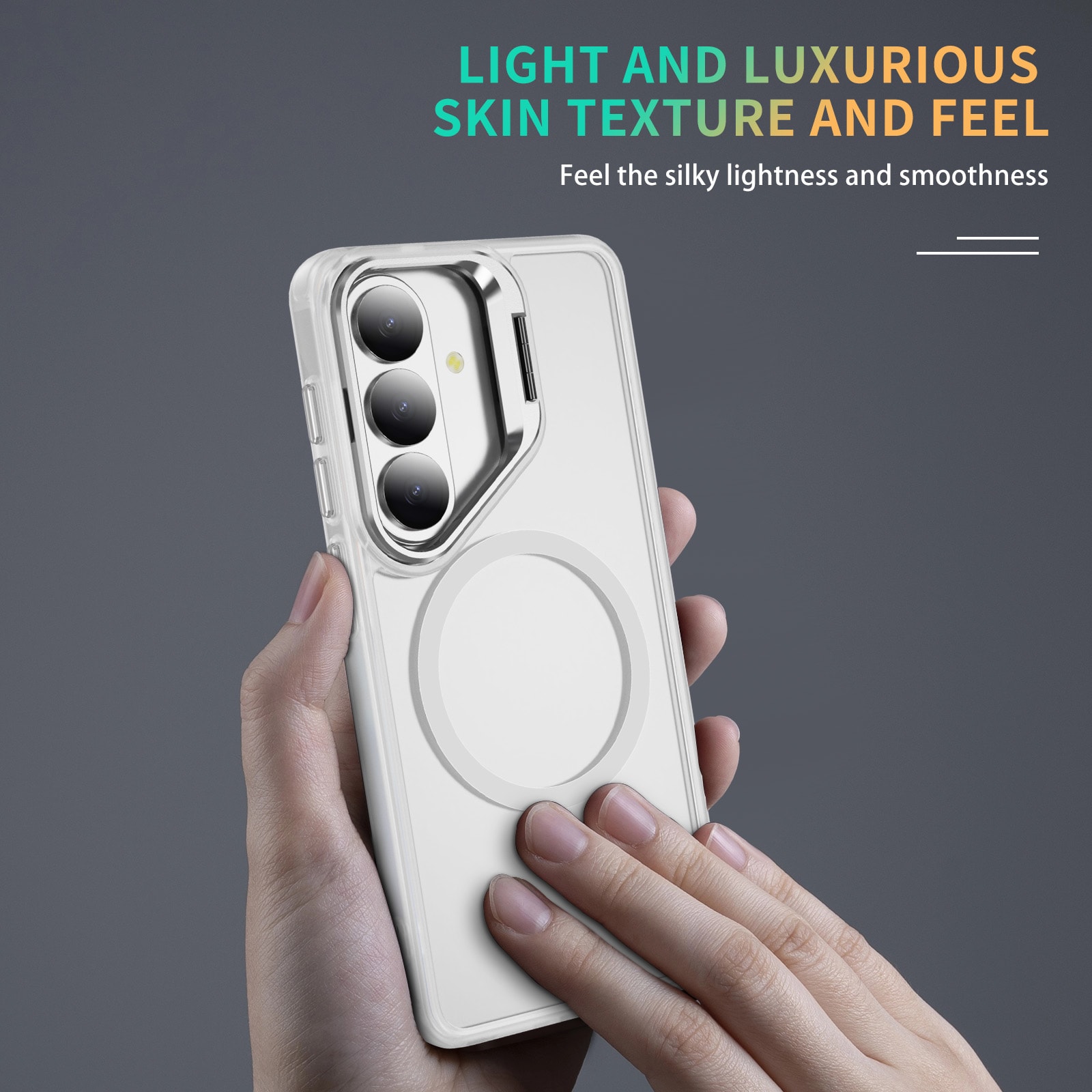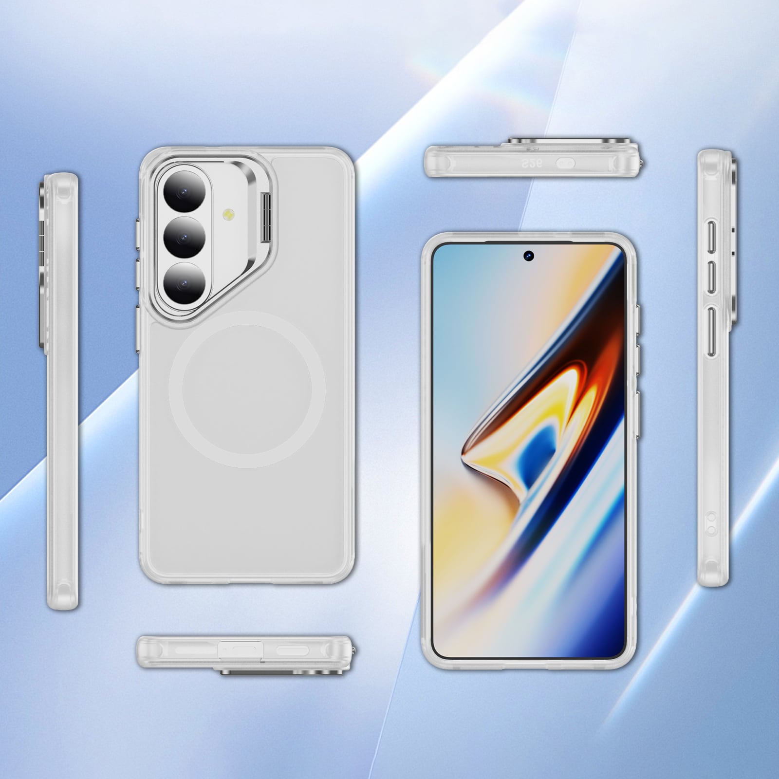 Stilig og praktisk hybriddeksel med utfellbar støtte og MagSafe til Samsung Galaxy S26. For best mulig beskyttelse mot støt og fall er dekselet todelt med en TPU-kjerne og et skall i hardplast. Dekselet har en metallramme rundt kameraet som hindrer skader på kameraobjektivene og fungerer også som et praktisk stativ for visning av filmer, videoklipp eller spill med komfortabel visningsvinkel.