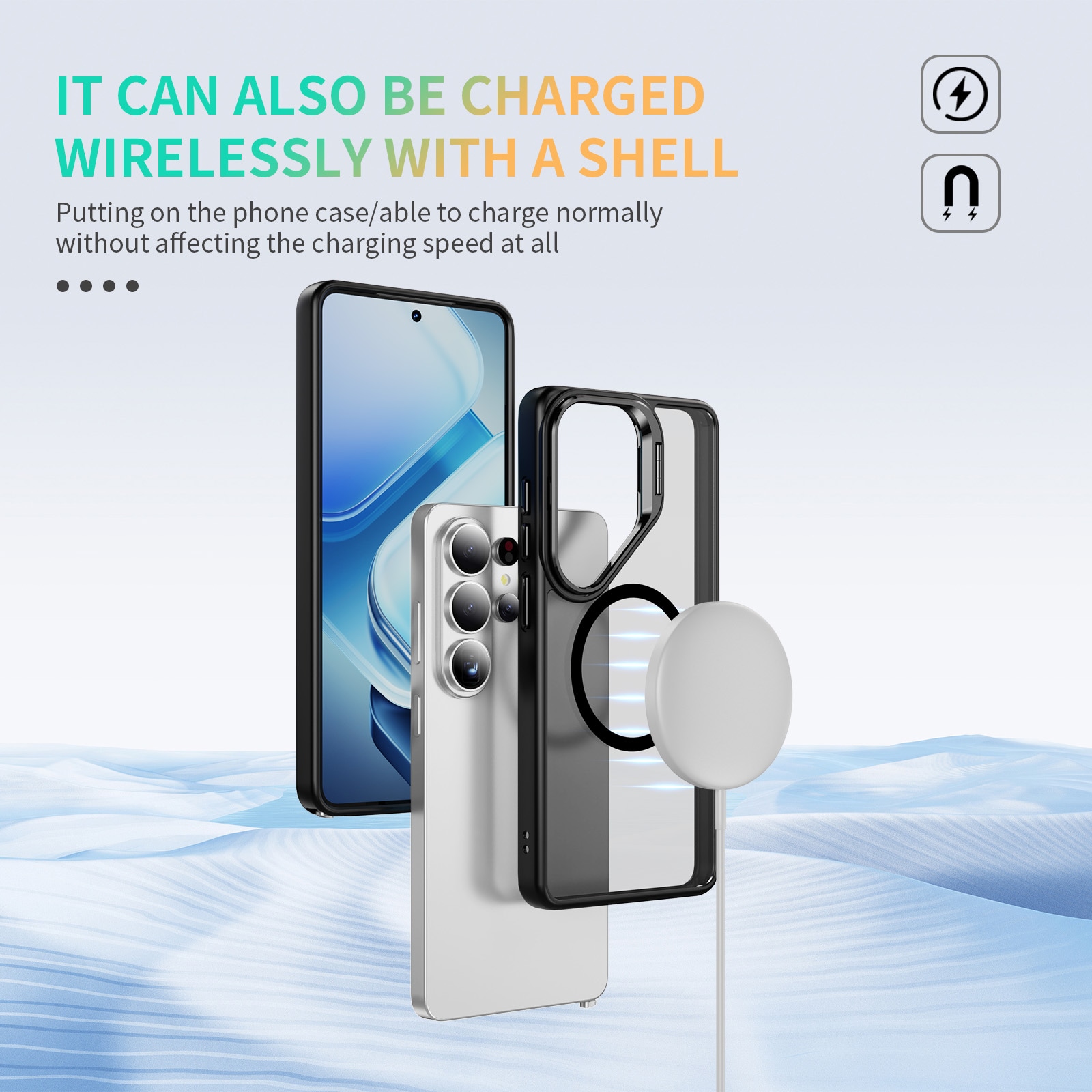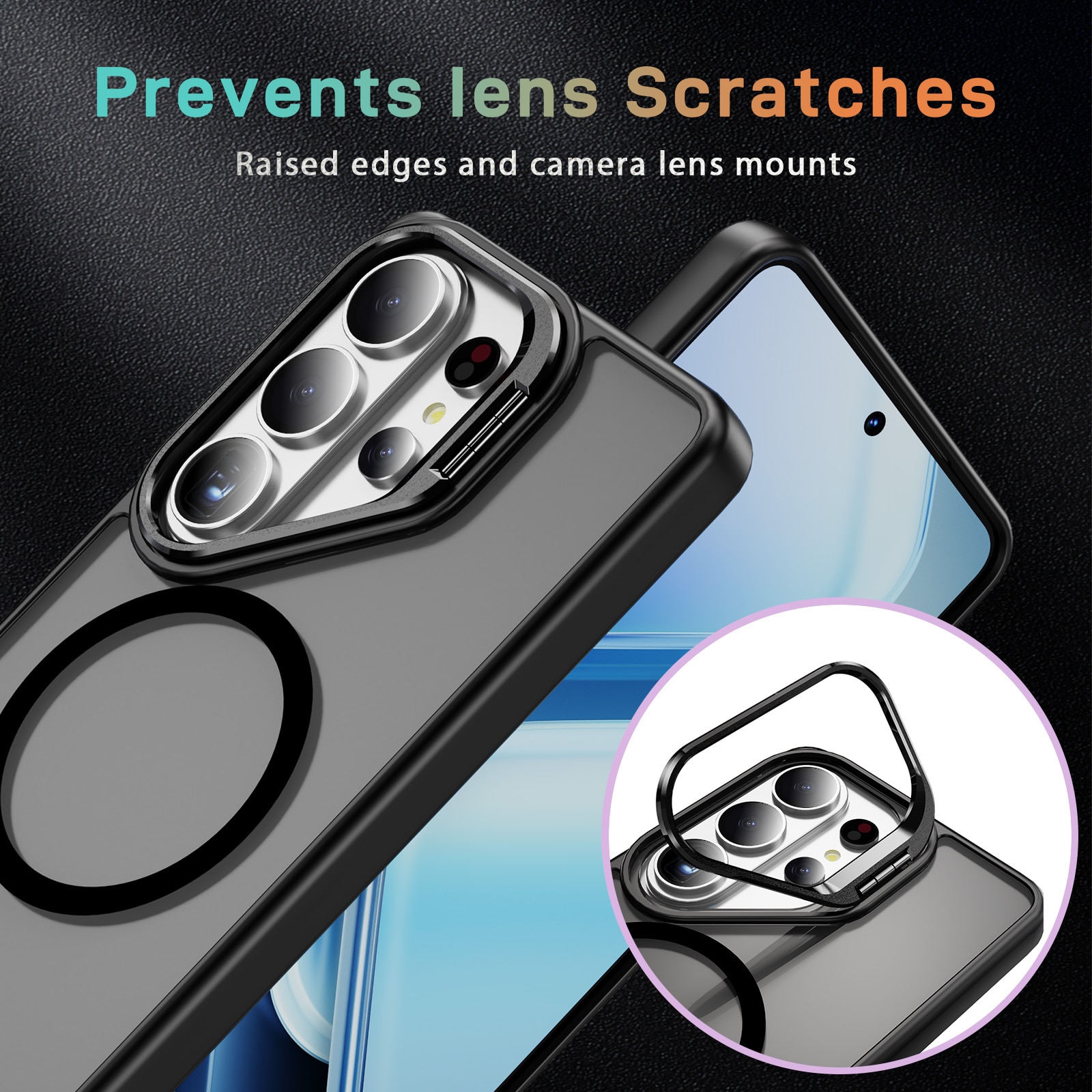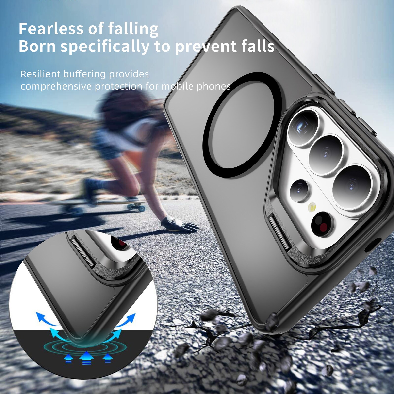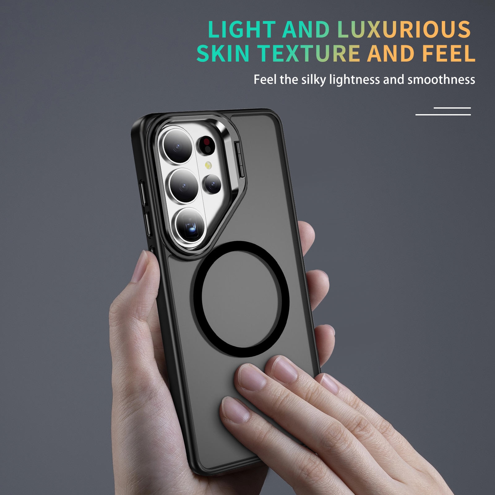 Stilig og praktisk hybriddeksel med utfellbar støtte og MagSafe til Samsung Galaxy S26 Ultra. For best mulig beskyttelse mot støt og fall er dekselet todelt med en TPU-kjerne og et skall i hardplast. Dekselet har en metallramme rundt kameraet som hindrer skader på kameraobjektivene og fungerer også som et praktisk stativ for visning av filmer, videoklipp eller spill med komfortabel visningsvinkel.