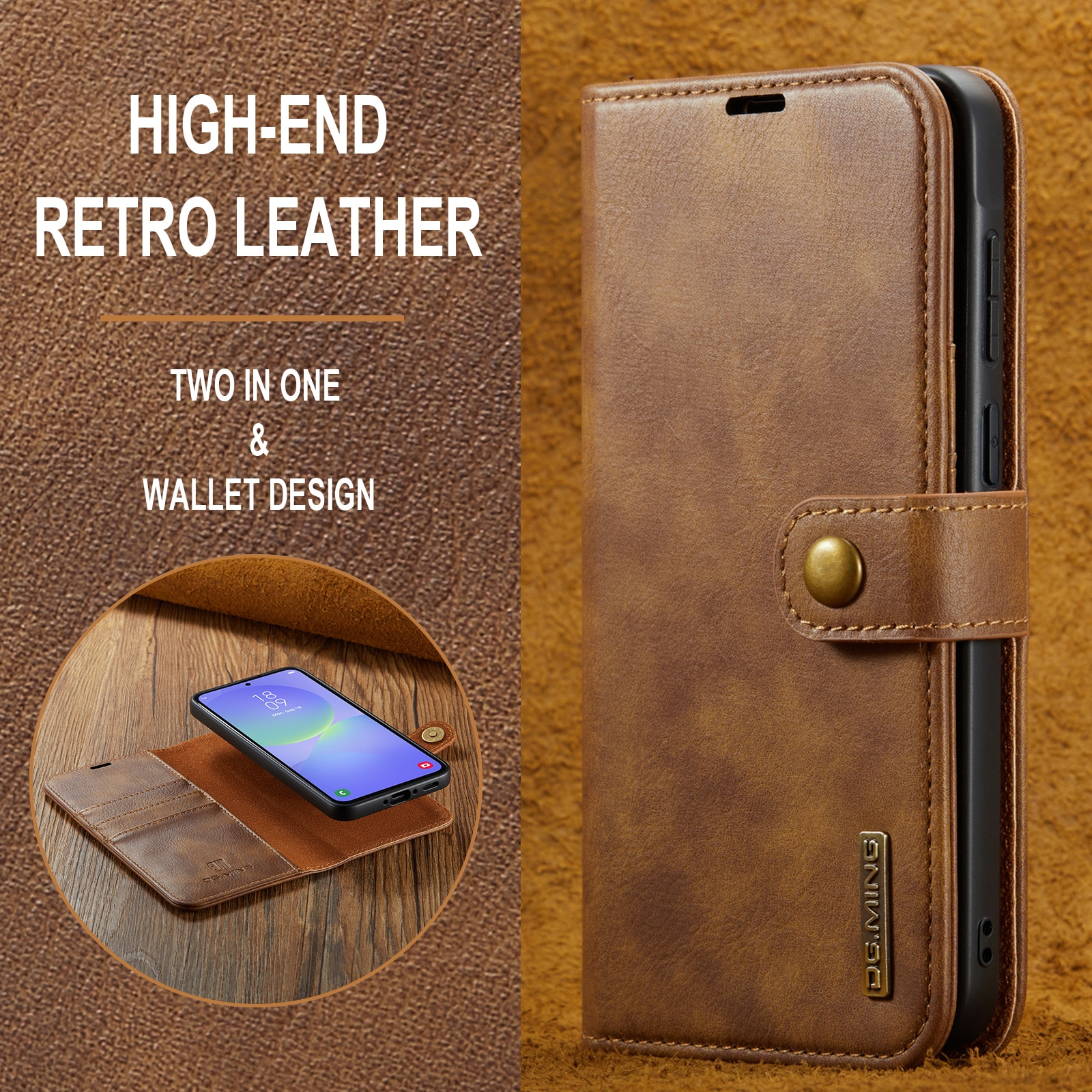 DG.MING etui med avtagbart magnetiskt deksel til Samsung Galaxy A37. Vesken har en klassisk og stilig design. Det avtagbare skallet betyr at du ikke trenger å bruke hele etui, for eksempel når du er hjemme eller på jobb.