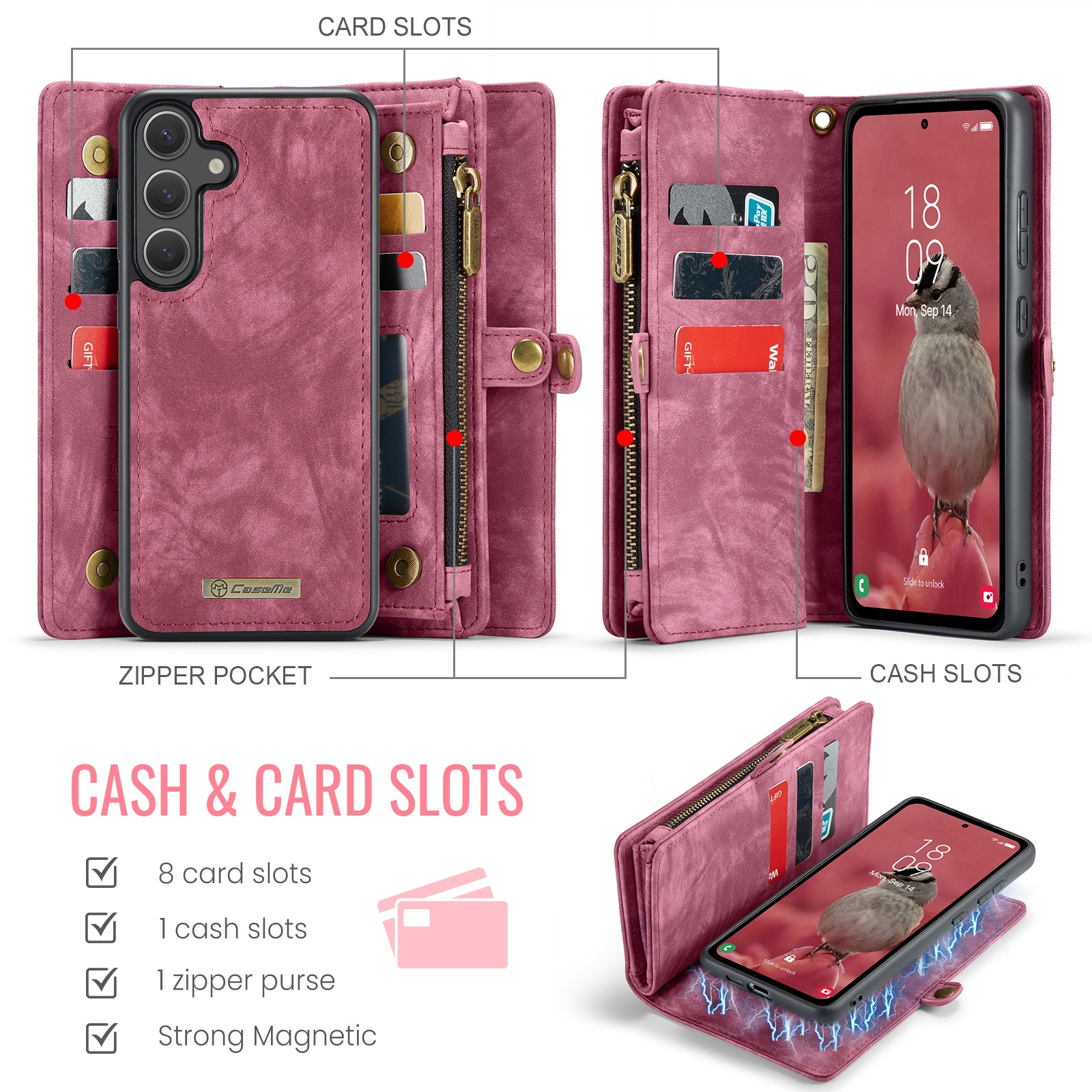 CaseMe mobiletui med magnetisk deksel og ekstra romslig lommebok med mange kortlommer til Samsung Galaxy S26. Lommeboken har flere kortlommer, en seddellomme og en myntlomme med glidelås.