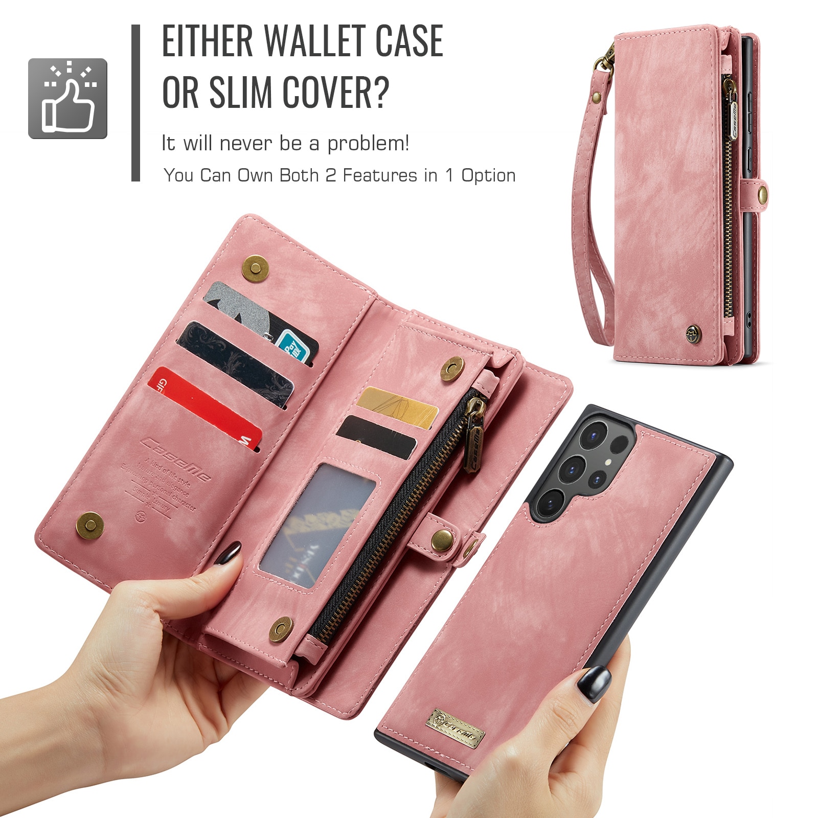 CaseMe mobiletui med magnetisk deksel og ekstra romslig lommebok med mange kortlommer til Samsung Galaxy S26 Ultra. Lommeboken har flere kortlommer, en seddellomme og en myntlomme med glidelås.