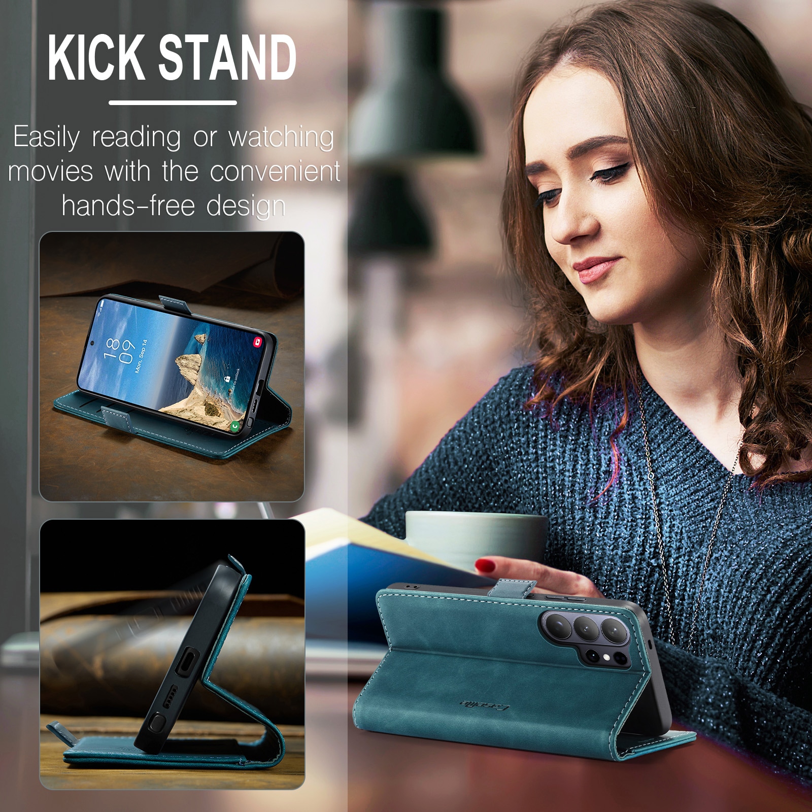 Lommeboken på innsiden av lokket har plass til kort, og det finnes en lomme for sedler eller kvitteringer. Ønsker du å se på film eller serier, kan du enkelt brette etuiet til et praktisk mobilstativ.