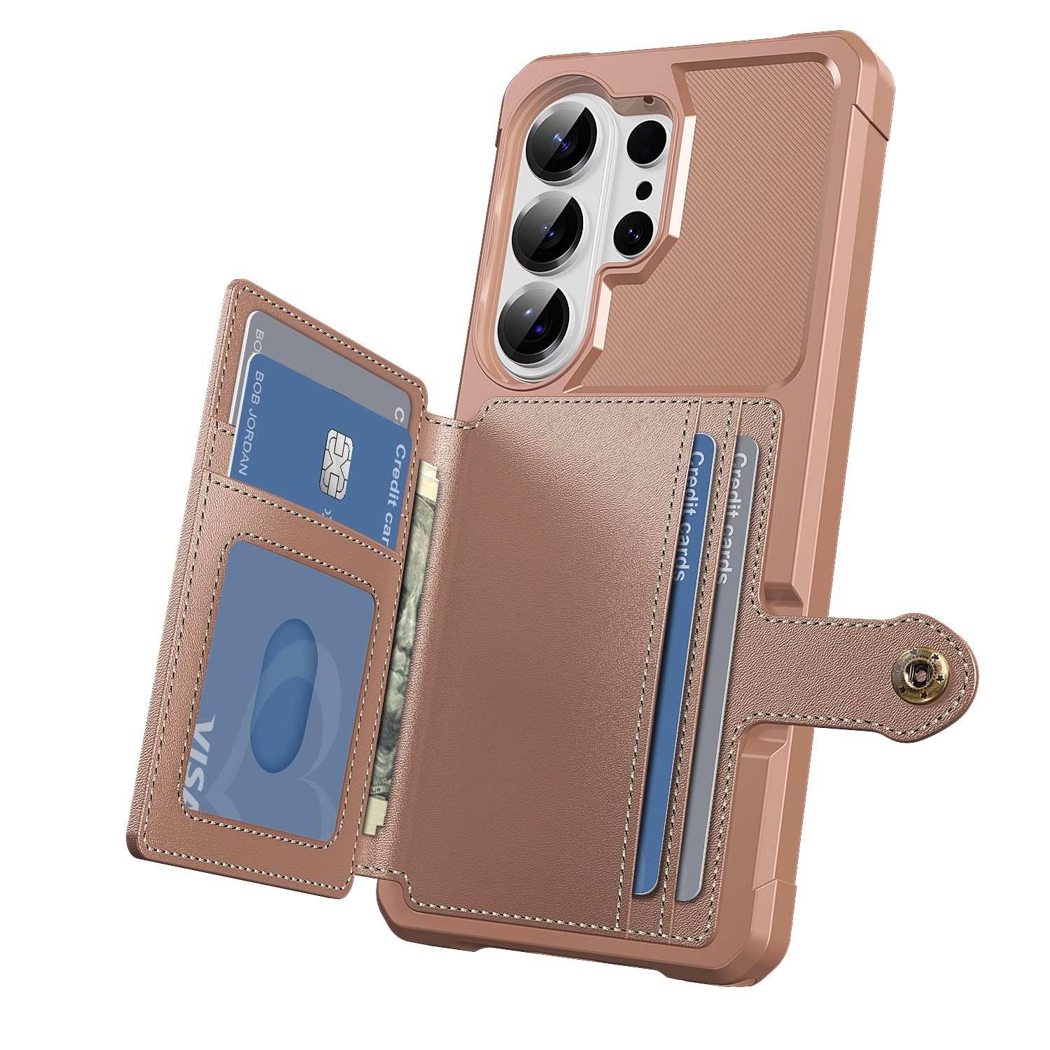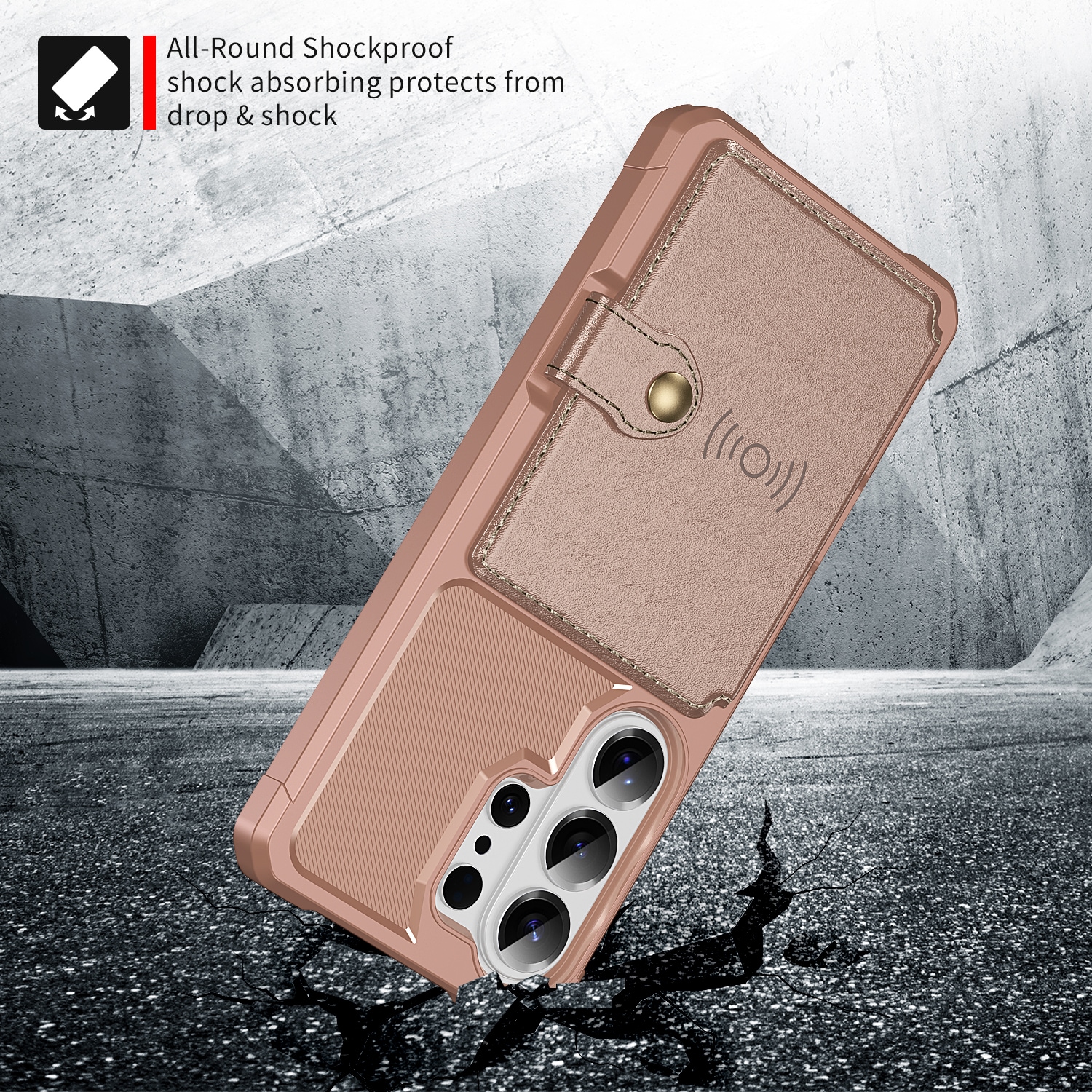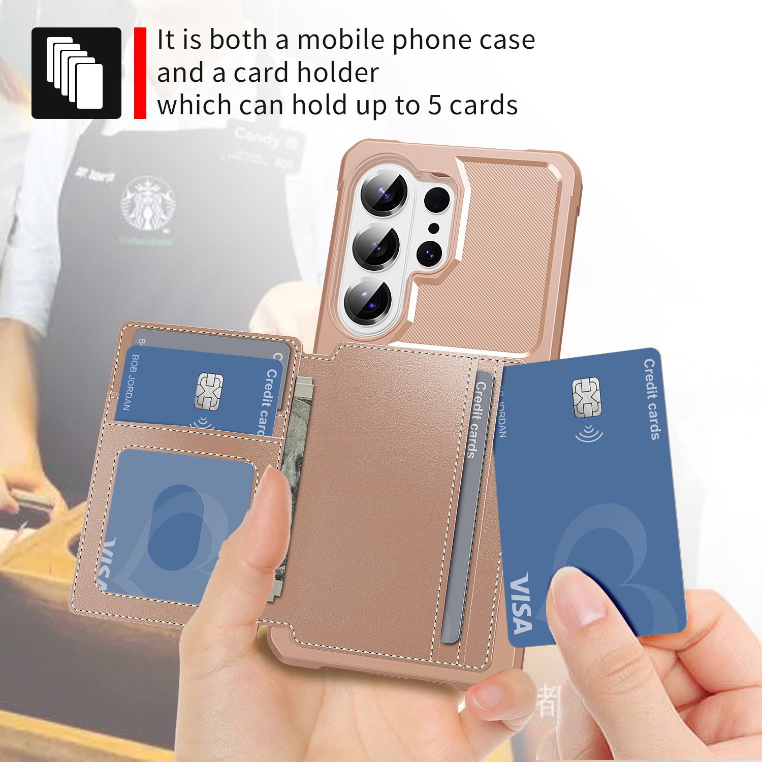 Støtdempende mobildeksel med skjult kortholder på baksiden. Dekselet har et stilig design og forsterkede hjørner for den beste beskyttelsen.
