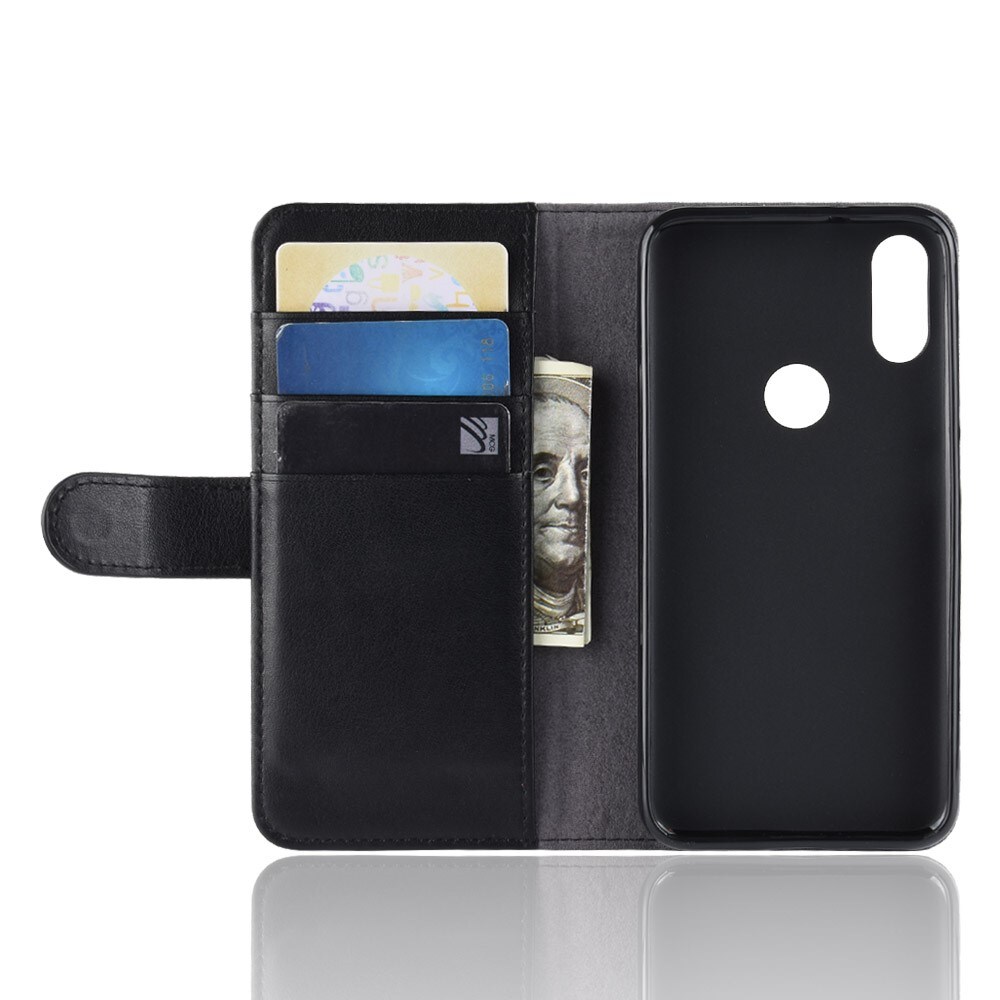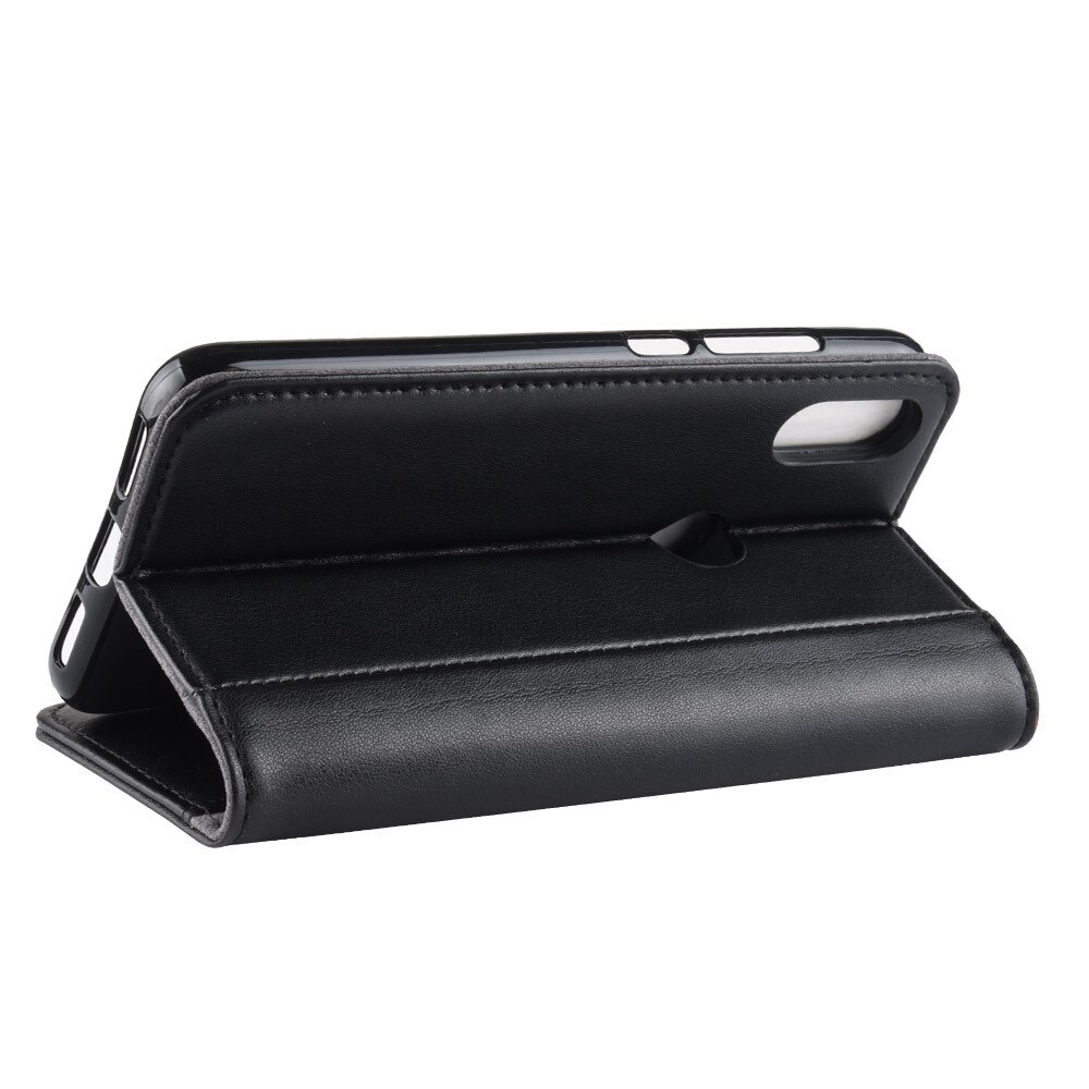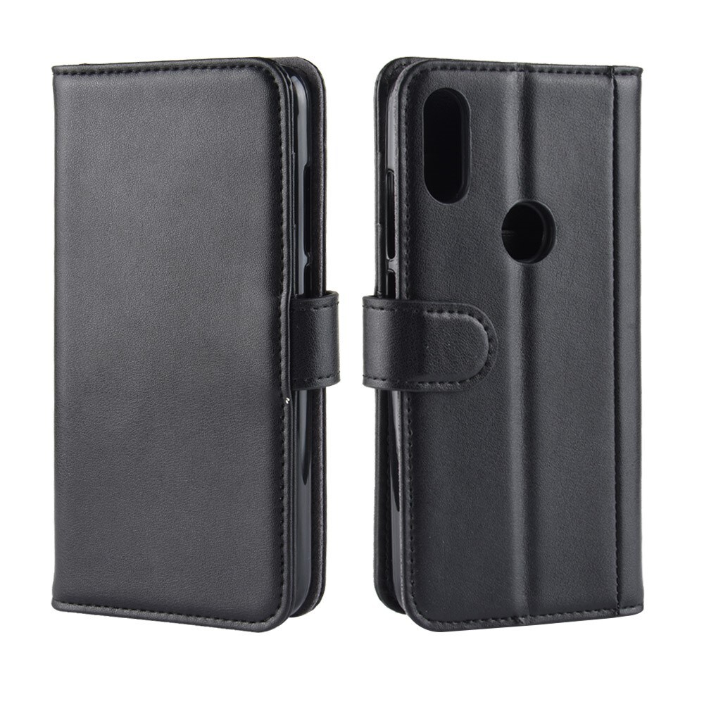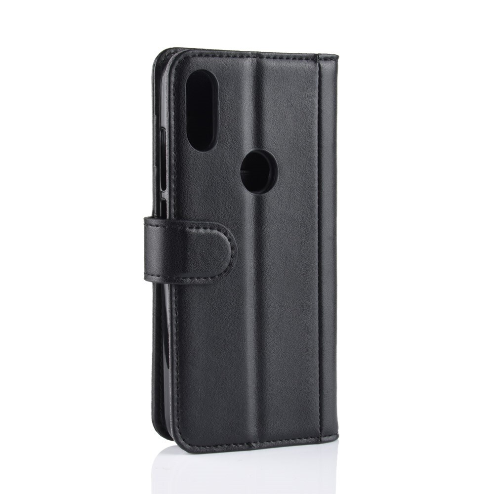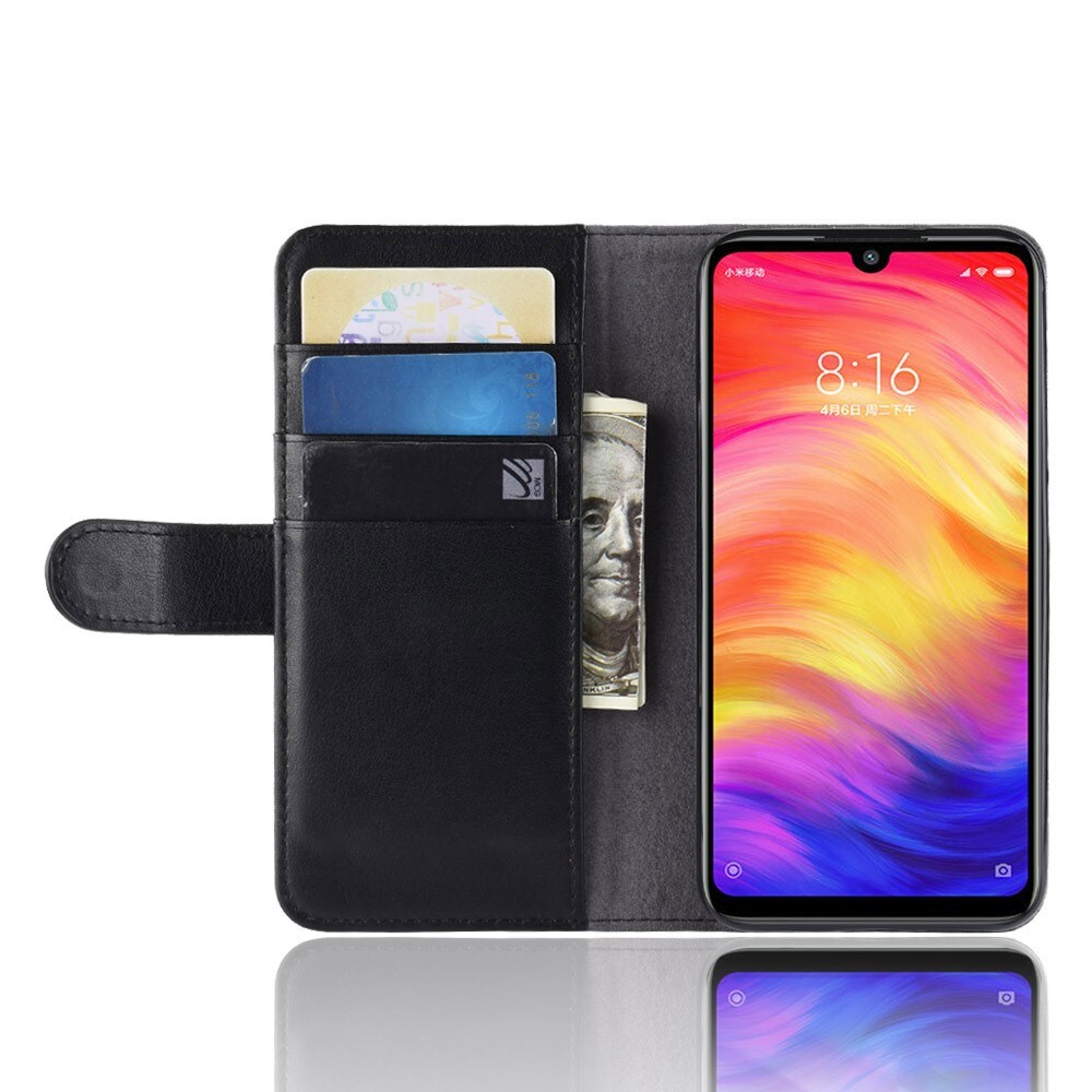 Mobilt lærveske i ekte lær til Xiaomi Redmi Note 7. Vesken beskytter hele telefonen og har en romslig lommebok på innsiden av dekselet. Lommeboken har tre kortlommer og en seddellomme.