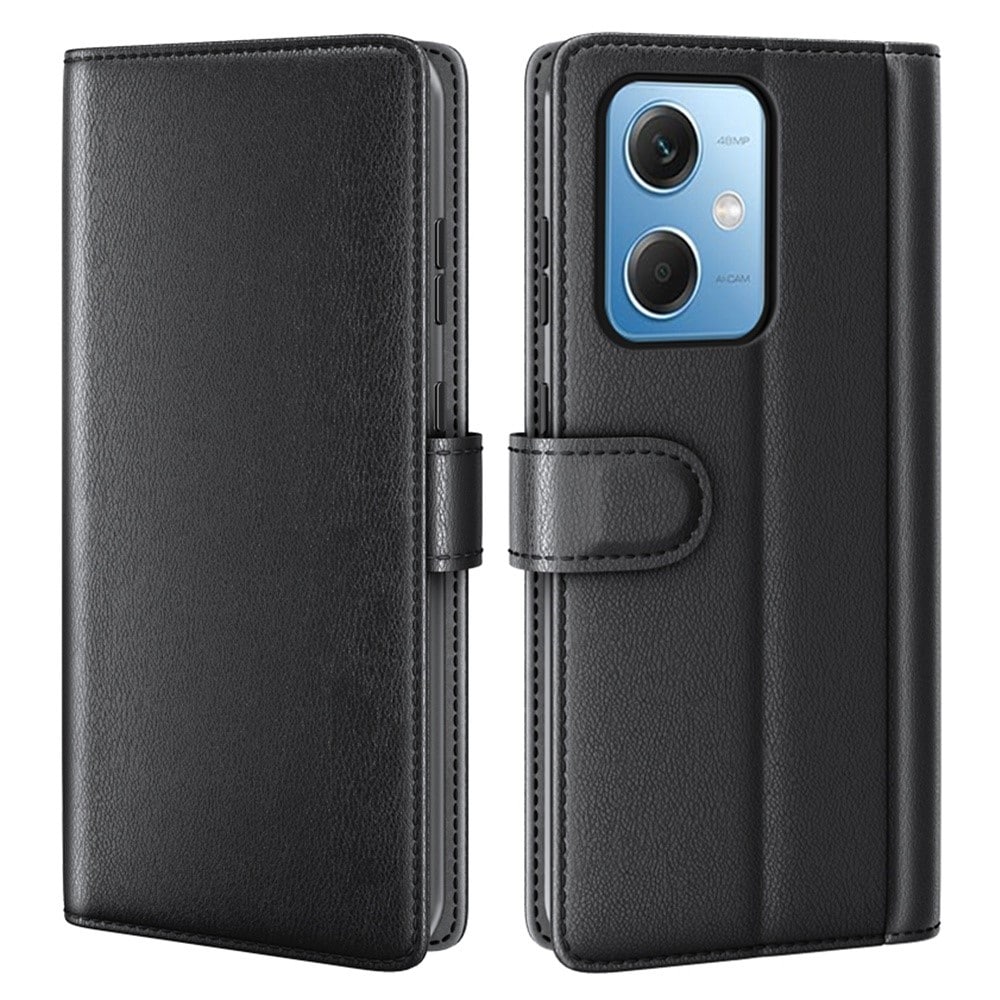 Mobilt lærveske i ekte lær til Xiaomi Redmi Note 12. Vesken beskytter hele telefonen og har en romslig lommebok på innsiden av dekselet. Lommeboken har tre kortlommer og en seddellomme.
