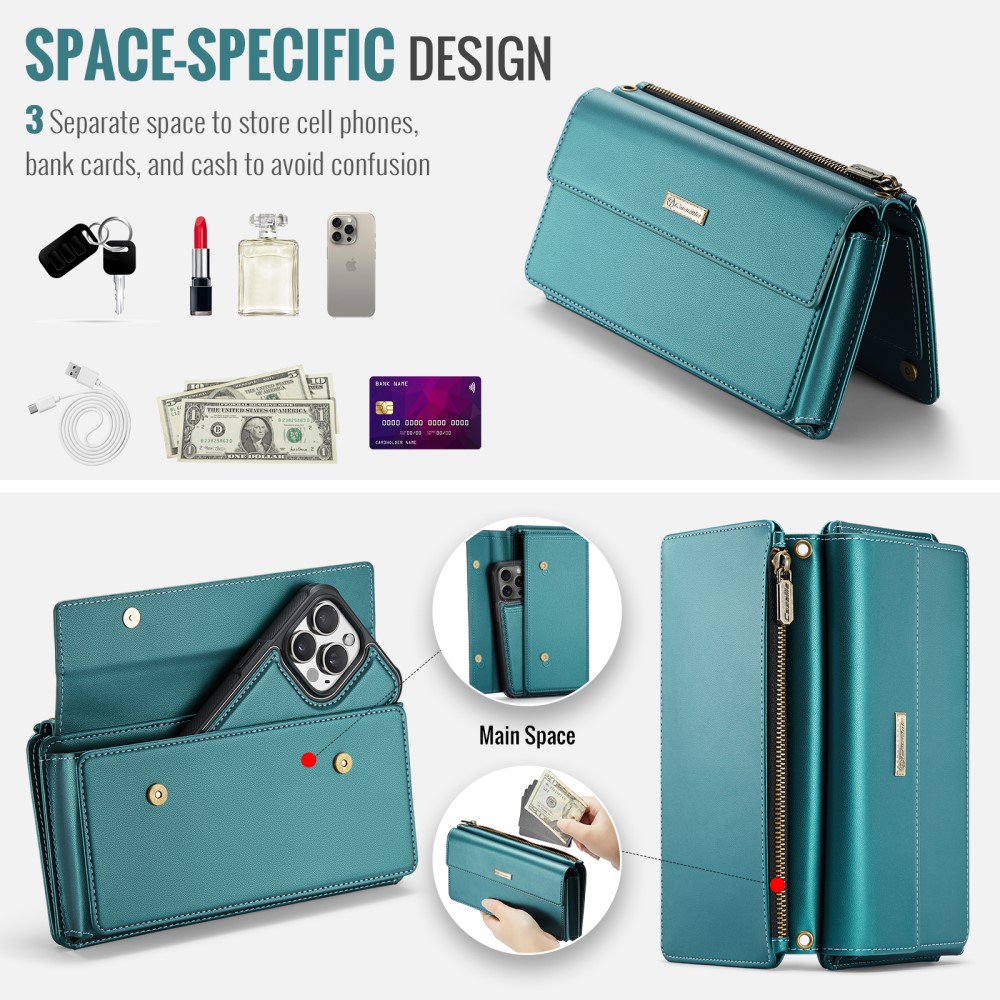 Stilig liten lommebokveske fra CaseMe. Denne vesken har plass til oppbevaring av telefonen din, men har også plass til kort og andre viktige småting. Vesken er utstyrt med totalt 7 kortspor, 2 seddelfack og en lomme med glidelås, i tillegg til det spesielle rommet for telefonen.