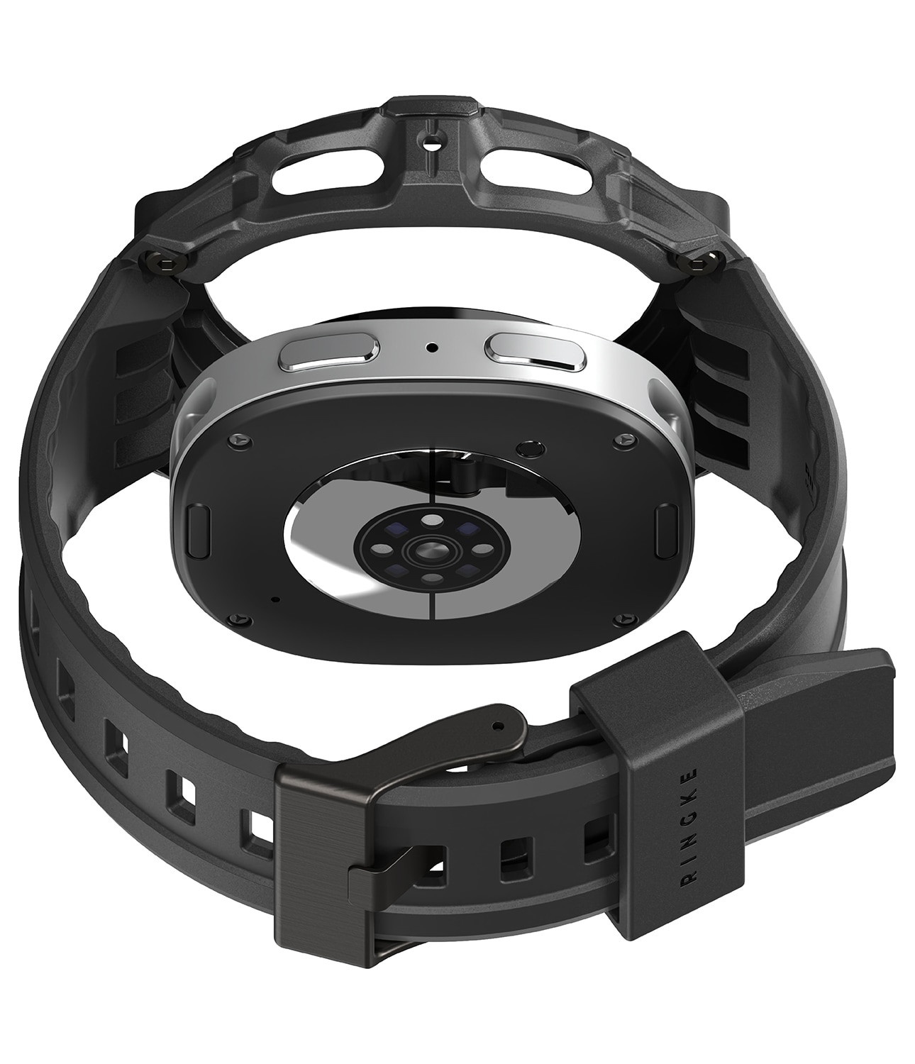 Beskyttelsen er laget i en hybridkonstruksjon av hard polykarbonat og fleksibel TPU som gir effektiv støtdemping og beskytter mot slag, støt og riper. Den integrerte reimen gir en stabil passform og sitter komfortabelt på håndleddet, selv ved lengre bruk.