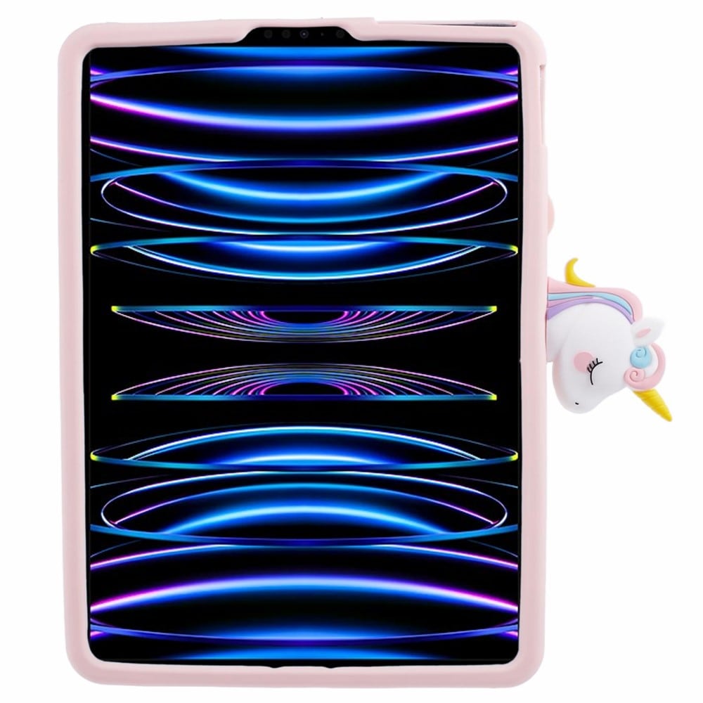 Støtsikkert deksel med enhjørningdesign til Apple iPad Air 11 7th Gen (2025). På baksiden av dekselet er det en bærering som både kan brukes til å bære dekselet, men som også kan felles ut som et stativ hvis du vil se på film, klipp eller skrive. Ringen kan roteres 360 grader slik at du kan plassere dekselet i den beste mulige vinkelen.