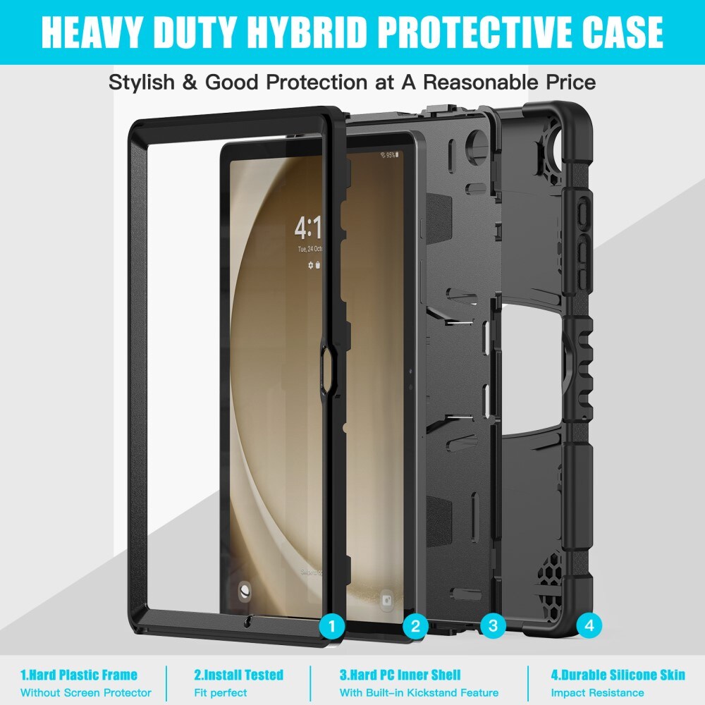 Støtsikkert hybriddeksel for Samsung Galaxy Tab A9 Plus med smart design. Dekslet er laget i tre ulike lag og har en beskyttende ramme for nettbrettets skjerm, og gir effektiv beskyttelse mot støt og fall. Det er også utstyrt med forsterkede hjørner som leder bort og absorberer støt.