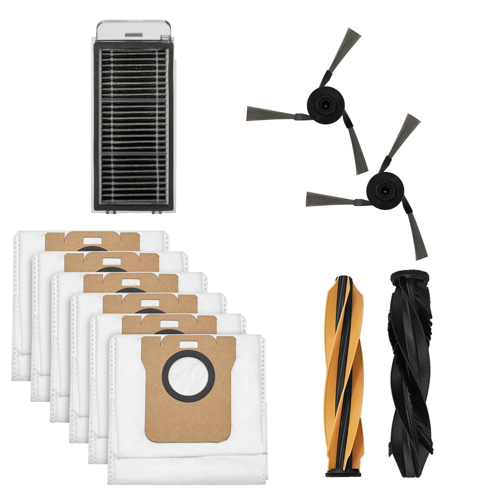 Tilbehørssett med støvsugerposer, filter, sidebørster og hovedbørster til Dreame Aqua 10 Ultra Roller. Dette settet inneholder alt nødvendig tilbehør for å optimalisere robotstøvsugerens funksjon og forlenge levetiden. Med disse ekstra tilbehørene får du mest mulig ut av støvsugeren og sikrer optimal ytelse ved hver bruk.