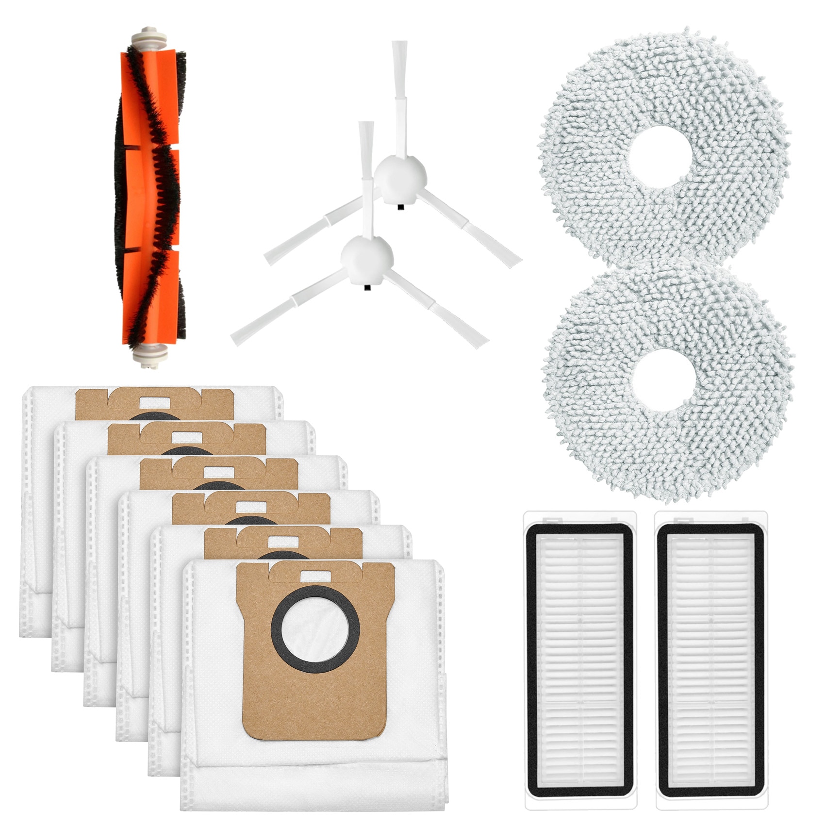 Inkluderer 6x støvsugerposer, 2x filtre, 2x moppduker, 2x sidebørster, 1x hovedbørste
