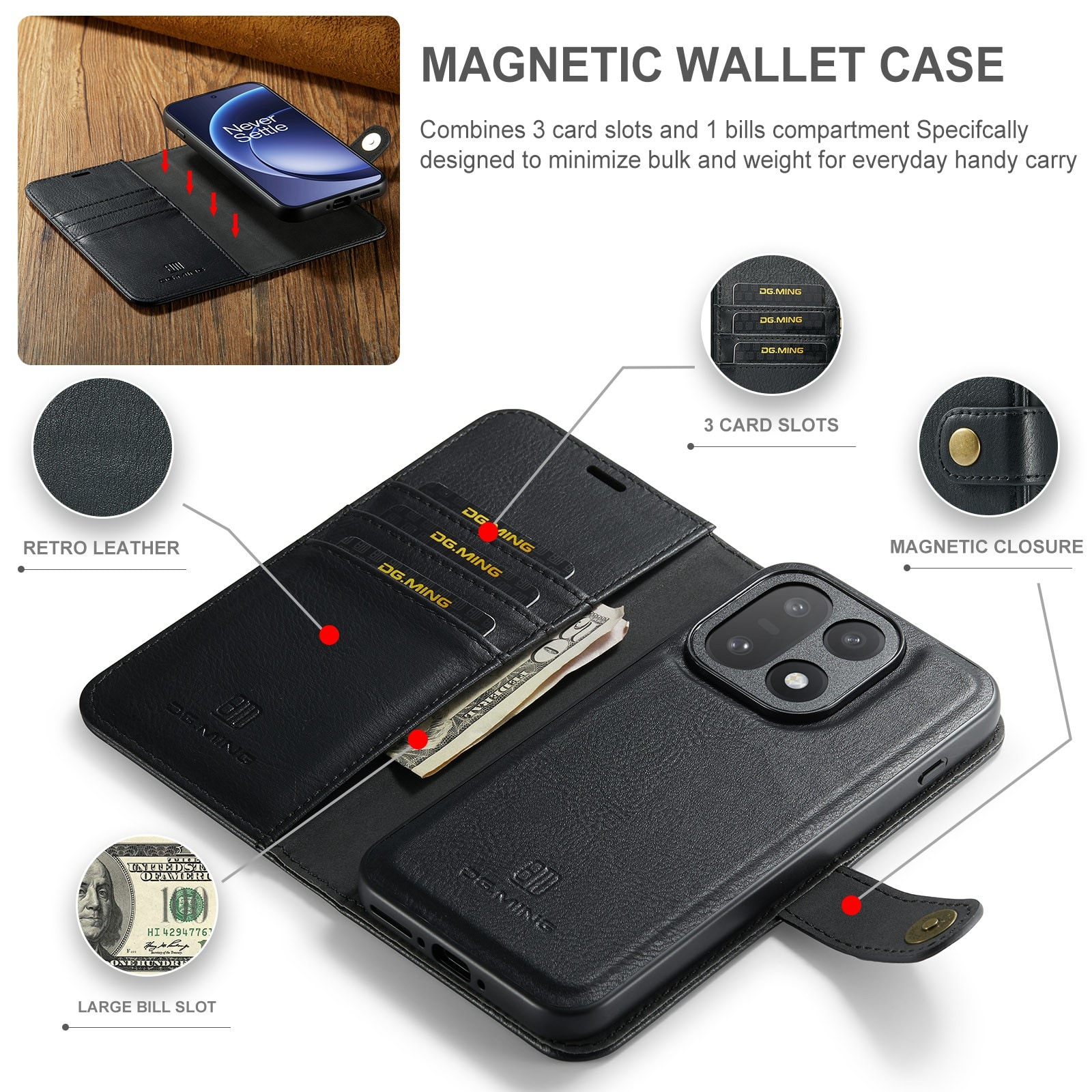 DG.MING etui med avtagbart magnetiskt deksel til OnePlus 15. Vesken har en klassisk og stilig design. Det avtagbare skallet betyr at du ikke trenger å bruke hele etui, for eksempel når du er hjemme eller på jobb.