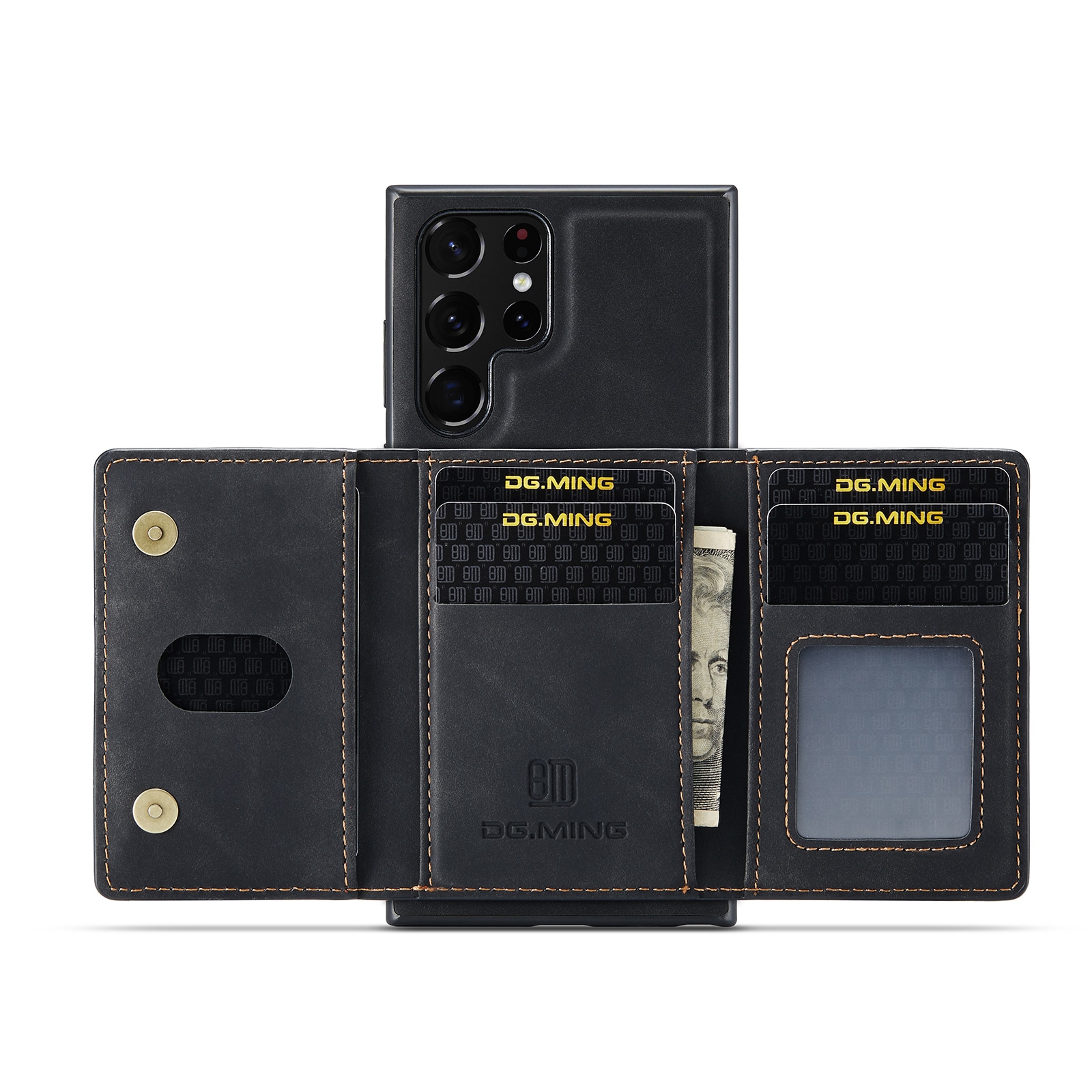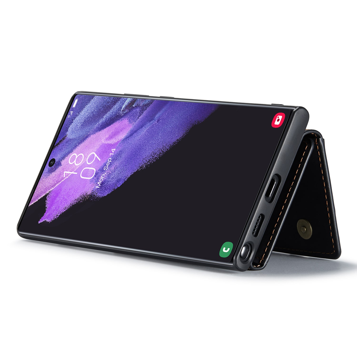 Deksel i kunstlær til Samsung Galaxy S26 Ultra med tilhørende lommebok. Lommeboken festes med magneter på baksiden av dekselet og kan enkelt tas av når du ikke trenger den. Ved å folde ut lommeboken kan den også brukes som stativ, slik at du enkelt kan se film eller videoer.