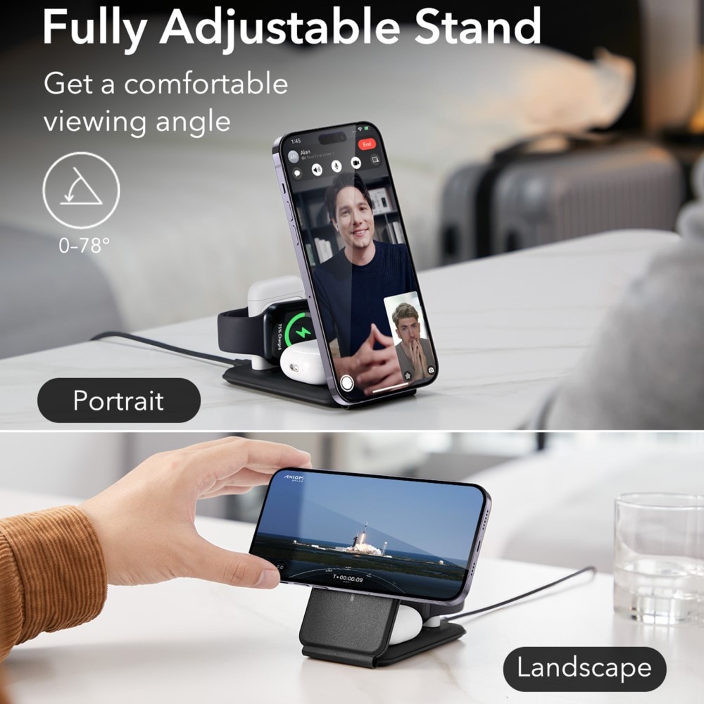 <p>Den MagSafe-kompatible laderen er utstyrt med sterke magneter som holder enhetene dine trygt på plass under lading. Du kan også justere vinkelen og velge mellom portrett- eller landskapsmodus for å bruke enhetene dine komfortabelt mens de lader. Den avtakbare lade-dokken for Apple Watch kan også brukes separat, noe som gir deg enda mer fleksibilitet.</p>