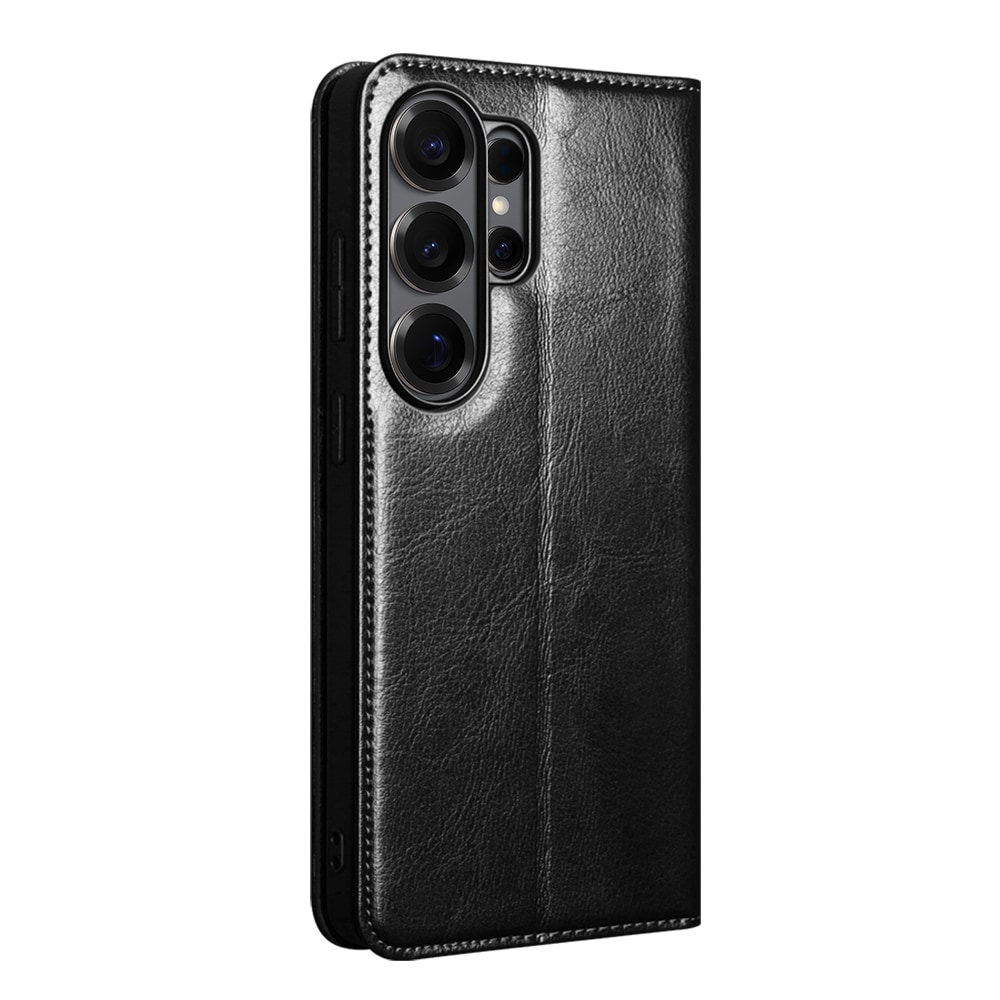 Mobilt lærveske i ekte lær til Samsung Galaxy S26 Ultra. Vesken beskytter hele telefonen og har en romslig lommebok på innsiden av dekselet. Lommeboken har 2 kortlommer og 1 seddellomme.
