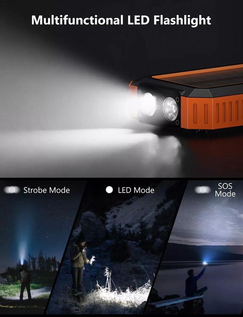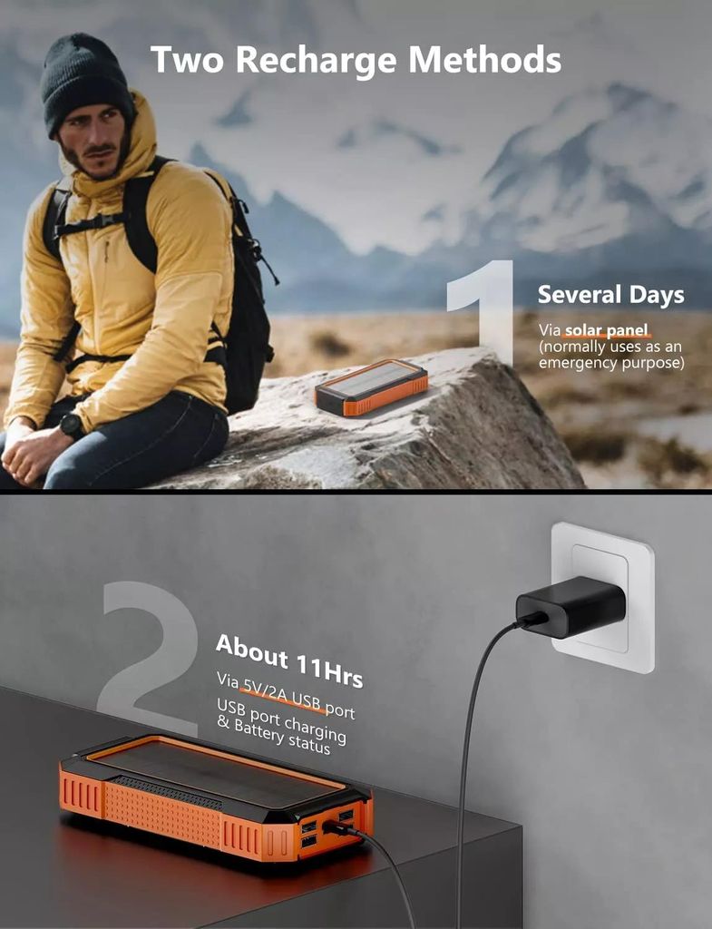Powerbanken kan lades via solpaneler, USB-C eller Micro-USB, noe som gir fleksibel bruk selv når strømuttak ikke er tilgjengelig. Den støtter trådløs lading opptil 15W og har USB-A-porter med hurtiglading for effektiv lading av flere enheter samtidig. Den innebygde lommelyk... Les mer